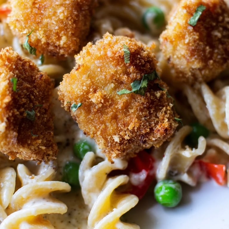 Save on Pinterest The afternoon sun hit my kitchen counter just right as I was frying those golden chicken bites, and I remember thinking this might be the best use of leftover pasta I'd ever stumbled upon. My roommate walked in from a run and immediately hovered over the stove, stealing a piece while I pretended not to notice. That's when I knew this salad wasn't just recipe development—it was something people would actually gather around.
