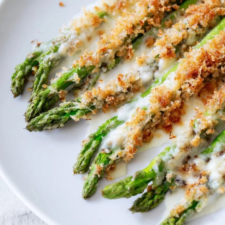 The breadcrumb crust adds a crunchy golden finish that contrasts the creamy sauce and tender asparagus.